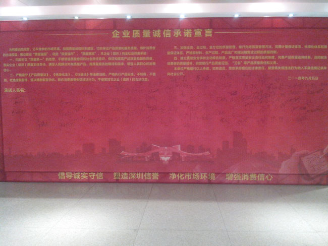 大會的高潮部分是所有與會的企業(yè)代表與政界代表一起舉起右手,宣讀《企業(yè)質(zhì)量誠信承諾書》:為構(gòu)建誠信經(jīng)營、公平競爭的市場環(huán)境,加強(qiáng)質(zhì)量誠信體系建設(shè),切實(shí)保證產(chǎn)品質(zhì)量,維護(hù)消費(fèi)者的合法權(quán)益,推動建設(shè)“質(zhì)量強(qiáng)國”,促進(jìn)“質(zhì)量強(qiáng)市”、“質(zhì)量惠民”。本企業(yè)向社會鄭重承諾:一、牢固樹立“質(zhì)量第一”的思想,不斷增強(qiáng)質(zhì)量意識和社會責(zé)任意識,保證和提高產(chǎn)品質(zhì)量,落實(shí)企業(yè)質(zhì)量主體責(zé)任,滿足人們?nèi)罕妼Ω哔|(zhì)量產(chǎn)品的期待和需求,增強(qiáng)人民群眾的消費(fèi)信心。二、嚴(yán)格遵守《產(chǎn)品質(zhì)量法》、《標(biāo)準(zhǔn)化法》、《計(jì)量法》等法律法規(guī),嚴(yán)格執(zhí)行產(chǎn)品標(biāo)準(zhǔn),不制假、不售假,杜絕虛假宣傳,堅(jiān)決抵制假冒偽劣、欺詐消費(fèi)者等失信違法行為,不侵害其他企業(yè)合法權(quán)益。三、加強(qiáng)全員、全過程、全方位的質(zhì)量管理,推行先進(jìn)質(zhì)量管理方法,完善計(jì)量保證體系、標(biāo)準(zhǔn)化體系和質(zhì)量保證體系,嚴(yán)格原材料,生產(chǎn)過程、產(chǎn)品出廠和儲運(yùn)銷售全過程的照顧質(zhì)量控制。四、建立質(zhì)量安全事故主動報(bào)告制度,嚴(yán)格落實(shí)質(zhì)量安全責(zé)任追究制度,完善產(chǎn)品質(zhì)量追溯體系,及時(shí)解決消費(fèi)者的質(zhì)量投訴,自覺履行產(chǎn)品質(zhì)量召回、“三包”等產(chǎn)品質(zhì)量責(zé)任和義務(wù)。本單位嚴(yán)格履行以上承諾。如有違反,愿意承擔(dān)相應(yīng)的法律責(zé)任,接受將失信違法行為納入不良信用記錄并向社會公開。二0一四年九月五日