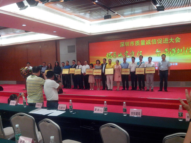 大會最后一項(xiàng)議程是頒發(fā)2013年“廣東省守合同重信用”證書及牌匾,我公司代表也受邀請上臺領(lǐng)取證書及牌匾。